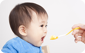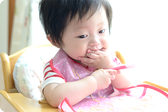 食事は栄養源になることはもちろん、食事の仕方や姿勢、噛む回数などがお子さんの生涯の口腔内の健康を作る土台としての役割も担っています。さらに、前歯と唇の使い方や、顎の成長・顔周りの筋肉が発達するとても大切な時期です。食べ物の色・形・香りなど五感を刺激し、薄味で味覚を育てます。食事の際は、家族で声を掛け、積極的にコミュニケーションを取りましょう。